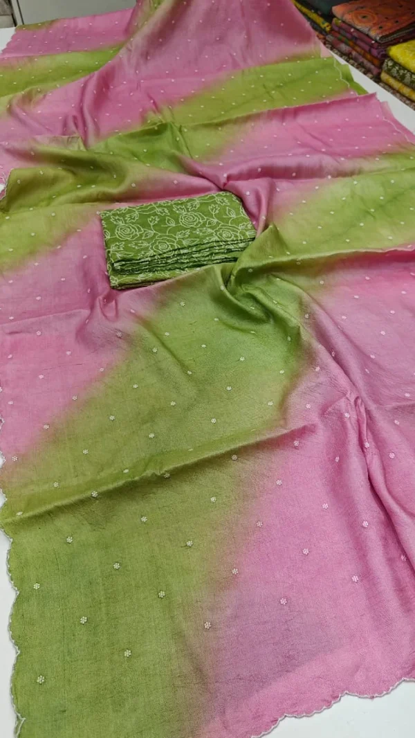 Elegant Dual Tone Tussar Silk Saree – Green & Pink with Chikankari Kust Embroidery