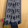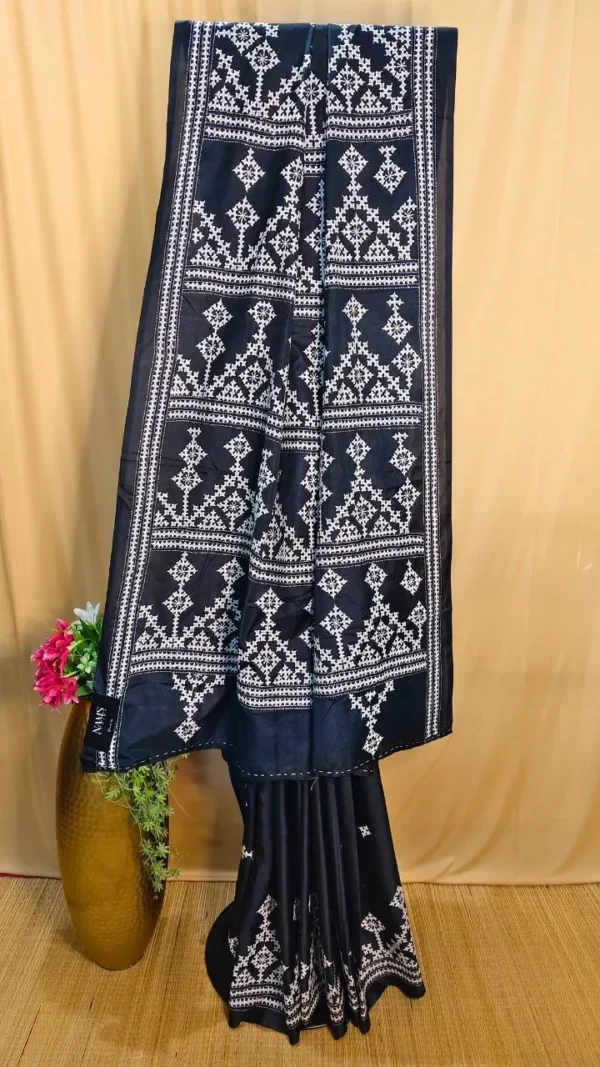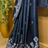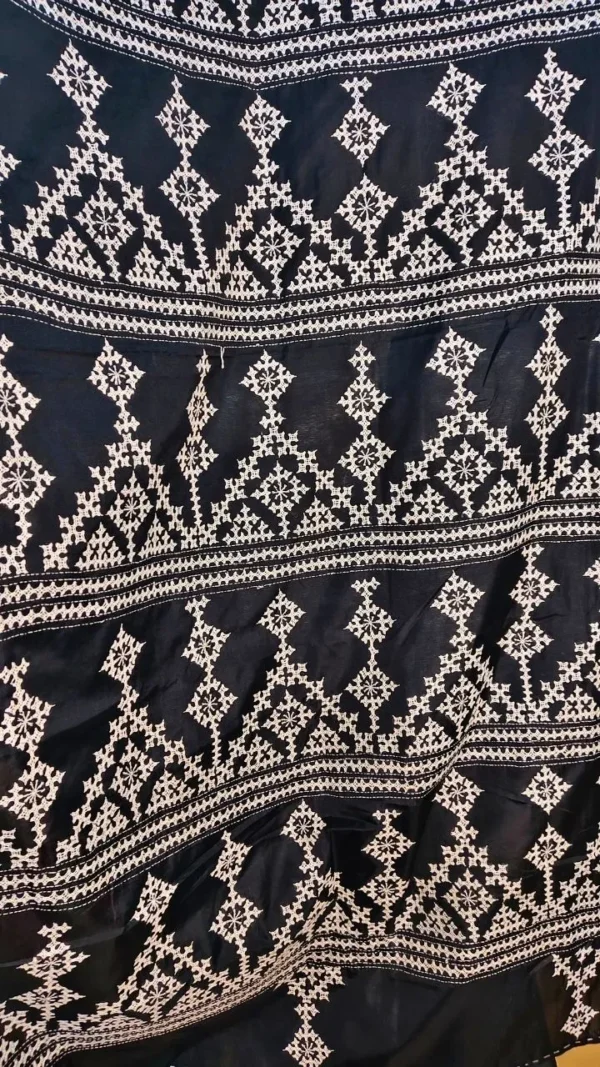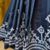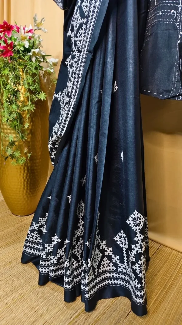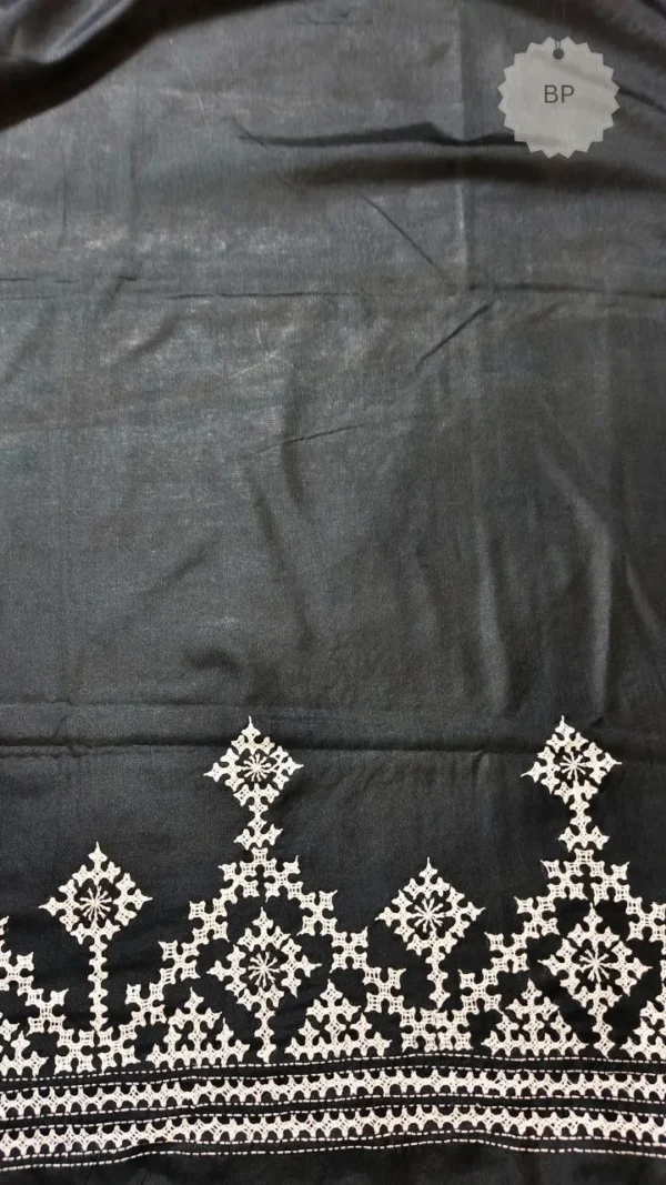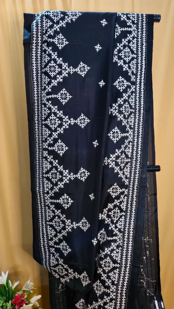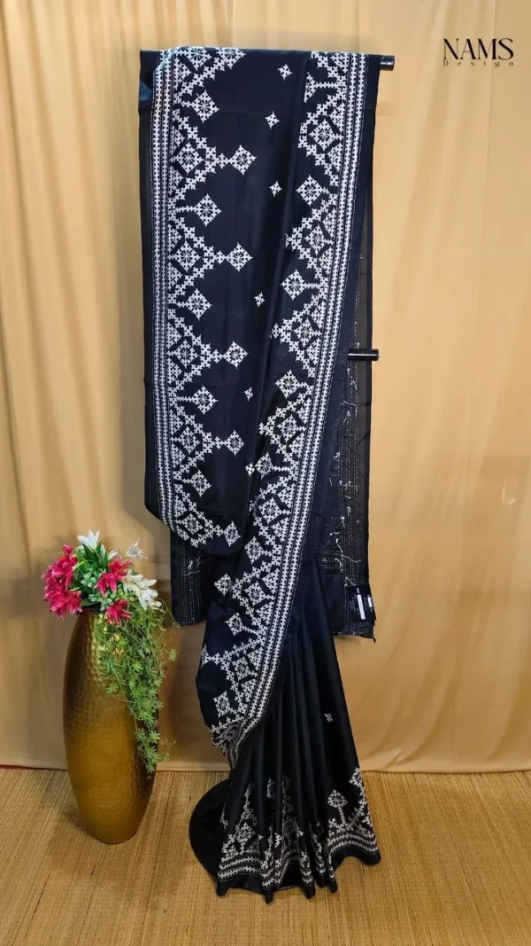 Gujarati work, often characterized by its fine threadwork and symmetrical patterns, elevates the saree’s aesthetic appeal. The white embroidery against the black silk creates a mesmerizing contrast, ensuring you stand out effortlessly. This artistry not only enhances the saree’s beauty but also preserves a cherished cultural craft.