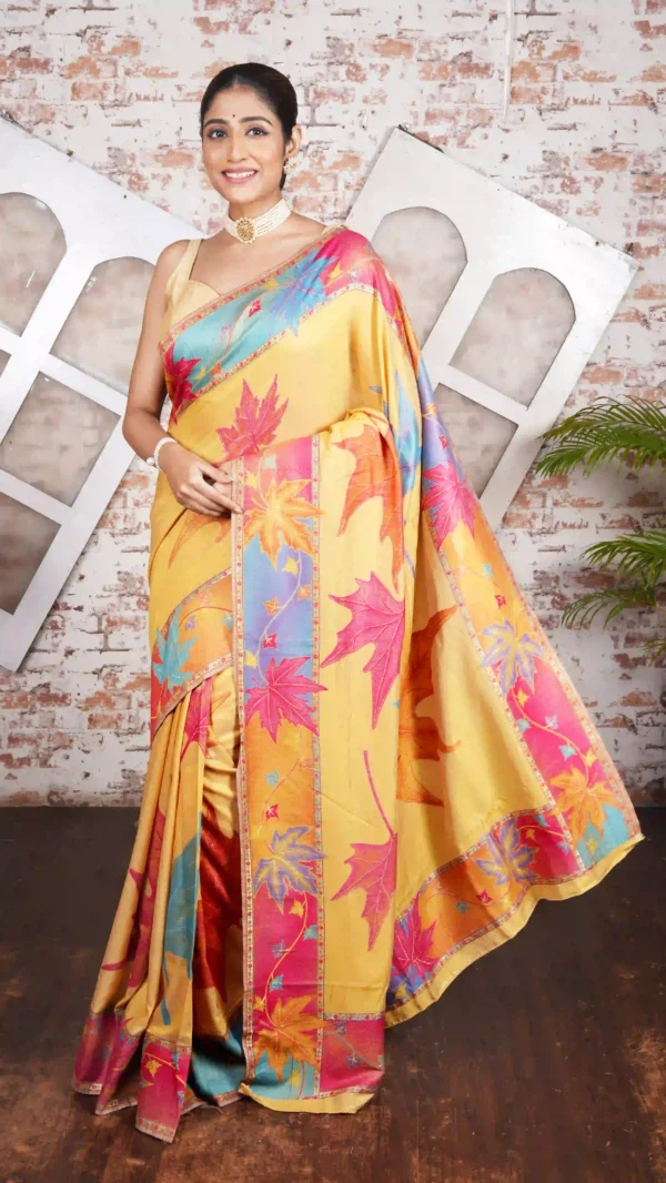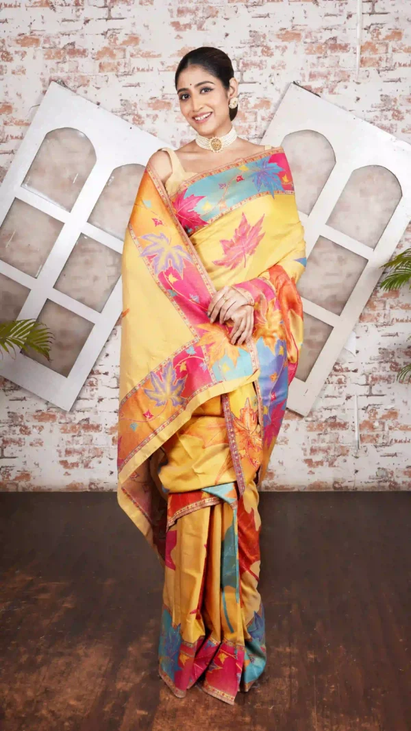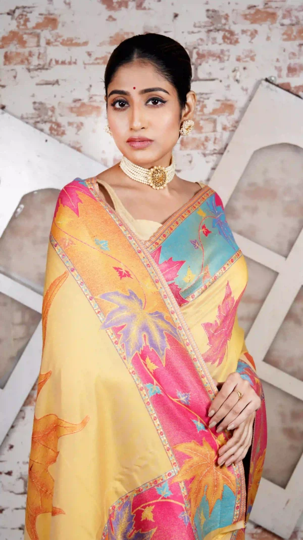 Radiant Yellow Pashmina Kani Silk Saree with Maple Leaf | 2025 Luxurious Winter Collection