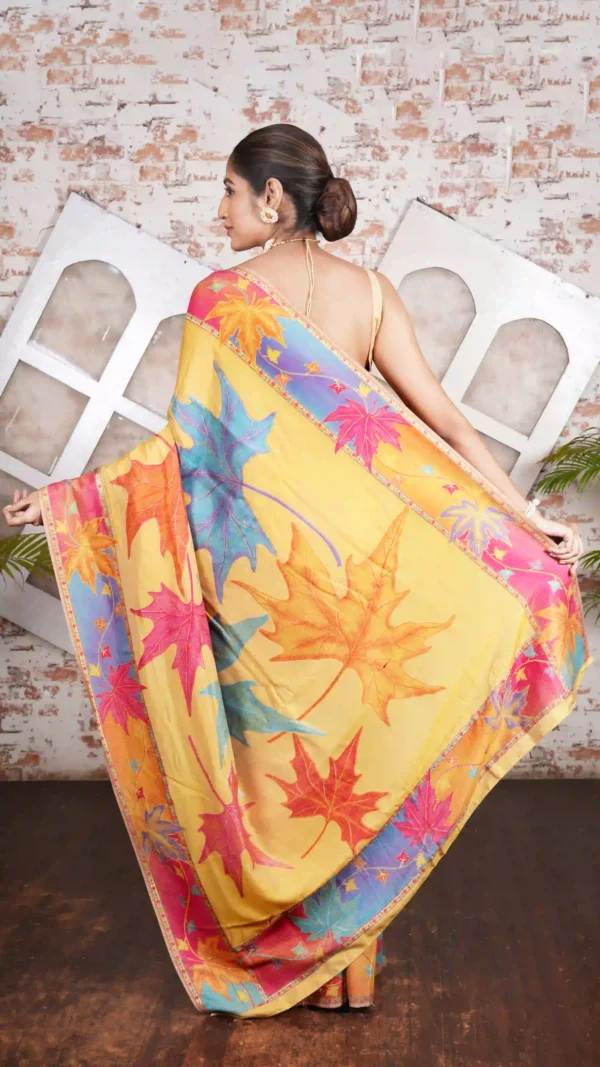 Wrap yourself in the artistry of Kashmir with our Radiant Yellow and Multicolor Maple Leaf Pashmina Kani Silk Saree this Winter Festive Season. The golden-yellow base glows with warmth, while the intricate multicolor maple leaf motifs breathe life into the drape, symbolizing growth, grace, and renewal. The maple leaf patterns, delicately interlaced in shades of gold, red, and green, reflect the splendor of changing seasons, while the soft pashmina-silk blend ensures unparalleled comfort and warmth while being soft and luxurious at the same time.