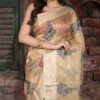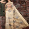 The soft beige body reflects the natural sheen and textured richness of authentic Kosa Tussar silk, creating a graceful drape that feels luxurious yet grounded.