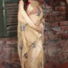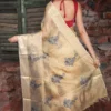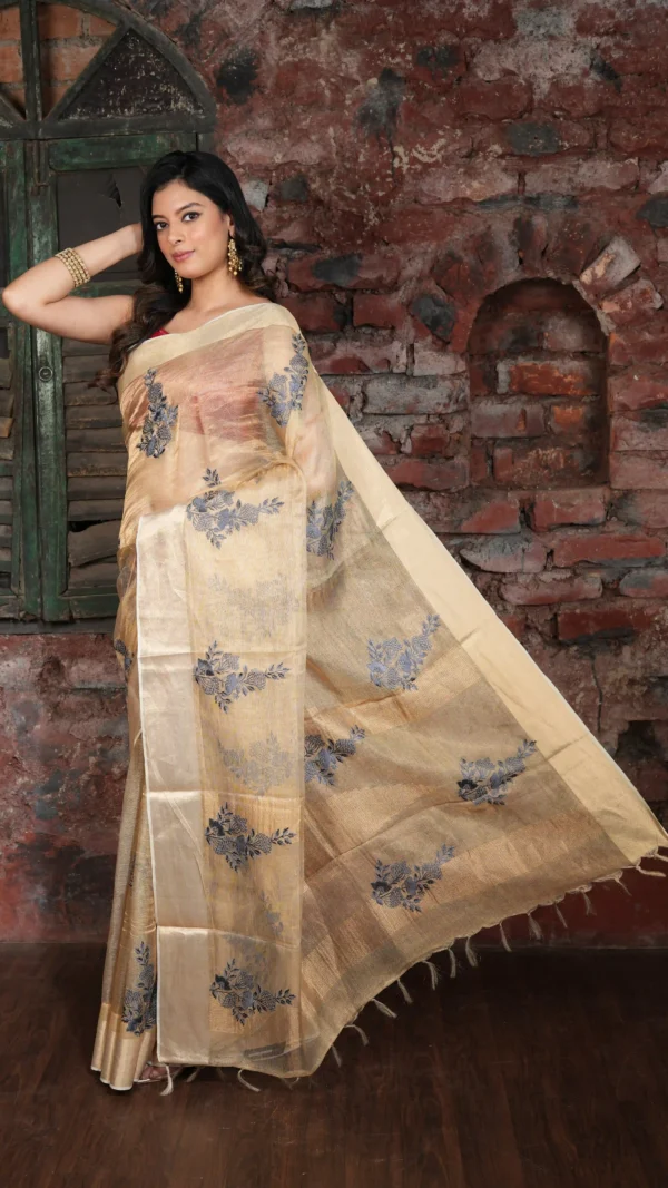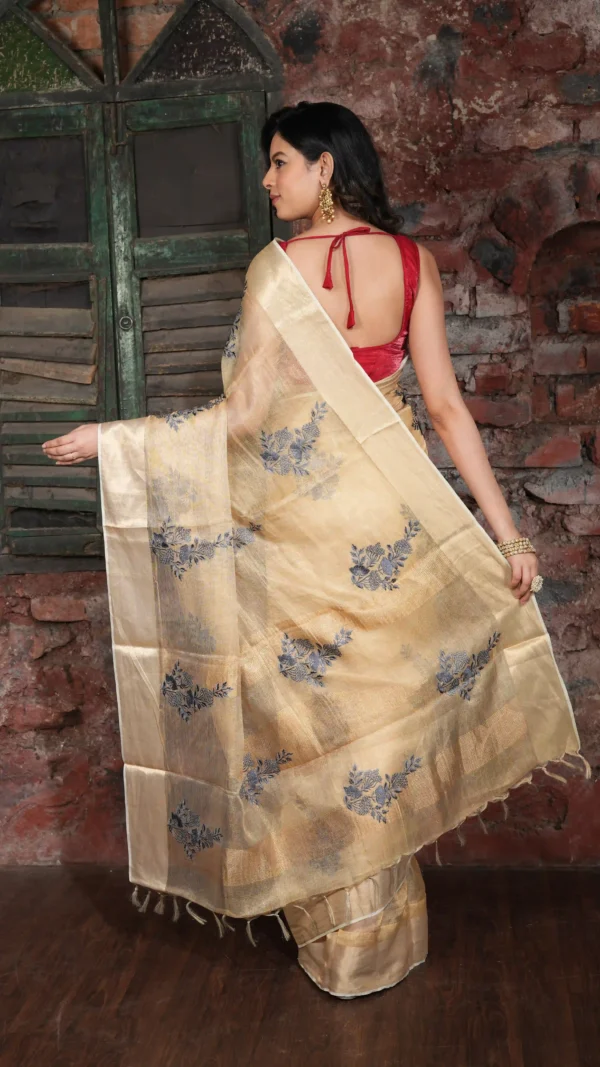 Champagne Gold Kosa Tussar Silk Saree with Blue Floral Embroidery | 2025 Nams Design Exclusive