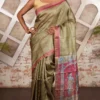 Olive Green Pure Tussar Silk Saree with Hand-Painted Artistry and Checkered Zari