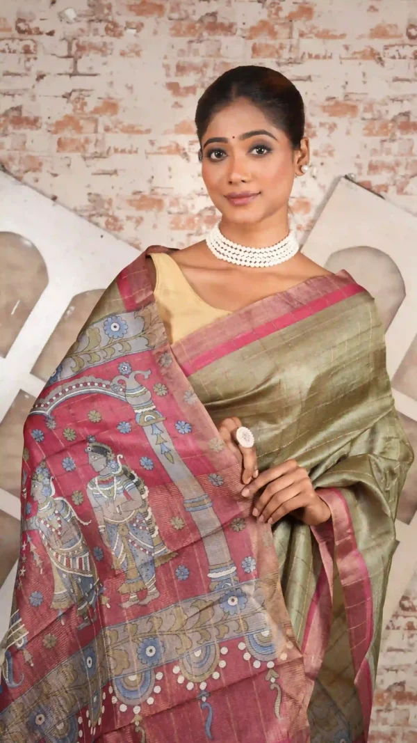 Embrace effortless sophistication with this Olive Green Pure Tussar Silk Saree, a beautifully handcrafted drape that combines the beauty of hand painted scenery with the natural elegance of pure Tussar silk.