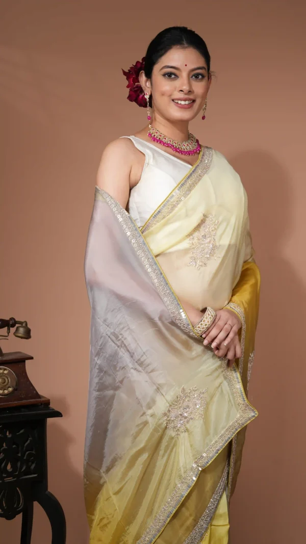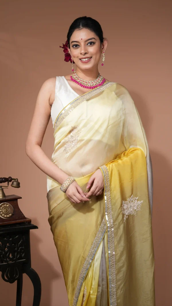 Ombre Green and Yellow Designer Organza Saree with Sequin Embellishments | 2025 Winter Festive