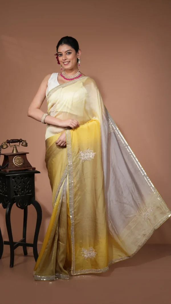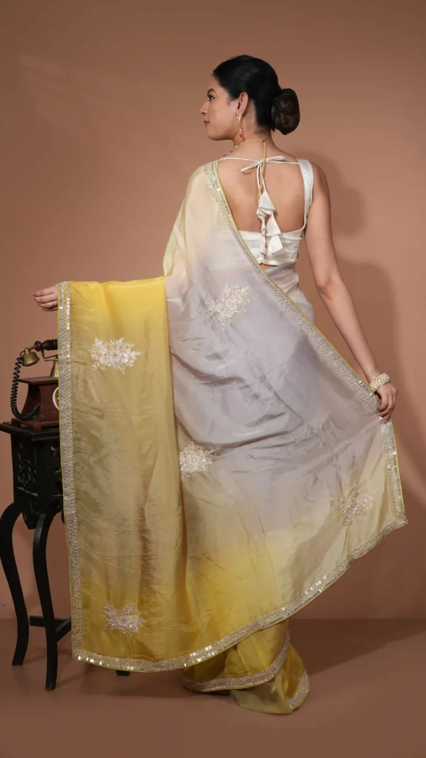 Celebrate this Festive Season with this enchanting Ombre Green and Yellow Designer Organza Saree with Sequin Embellishments, that is delicately embellished with shimmering sequin and stone work throughout the ombre body and the border, making it a perfect blend of traditional weaving and contemporary glamour. Light, ethereal, and undeniably stylish, this saree brings together the sophistication of soft pastels with the soft sparkle of designer embellishments, perfect for women who love grace with a touch of glamour.