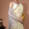 Crafted in an base of soft ombre pastel shades of yellow and green, this Contemporary saree carries the timeless sophistication and festive charm, enhanced with sparkling stone work that is meticulously handcrafted by artisans throughout the body and the border that lends an effortless designer appeal.