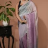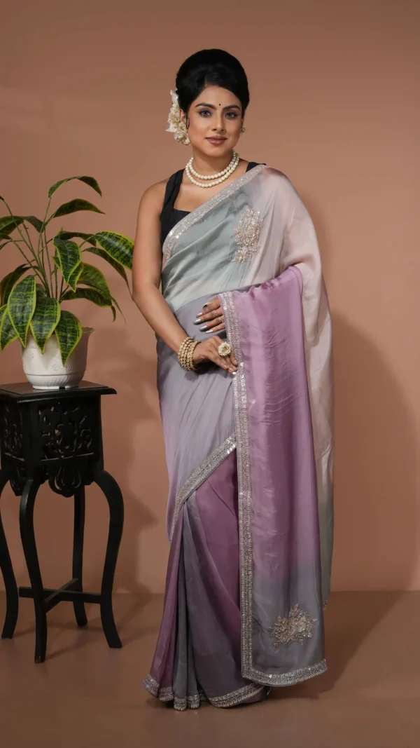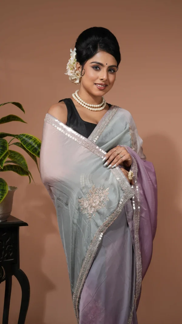 Celebrate this Festive Season with this enchanting Ombre Grey and Purple Designer Organza Saree with Sequin Embellishments, that is delicately embellished with shimmering sequin and stone work throughout the ombre body and the border, making it a perfect blend of traditional weaving and contemporary glamour. Light, ethereal, and undeniably stylish, this saree brings together the sophistication of soft pastels with the soft sparkle of designer embellishments, perfect for women who love grace with a touch of glamour.