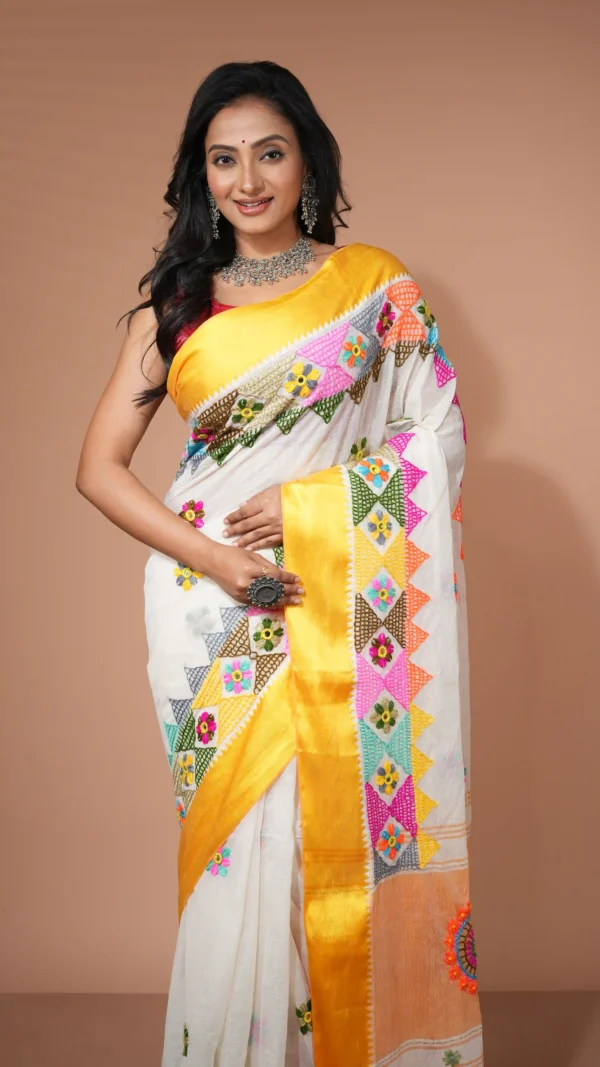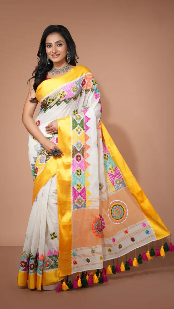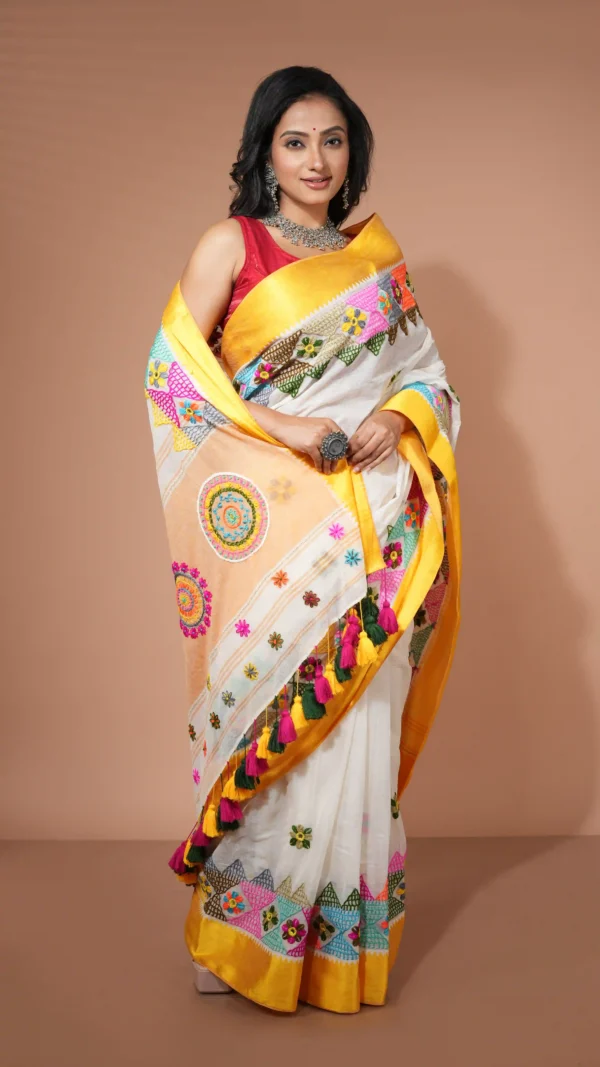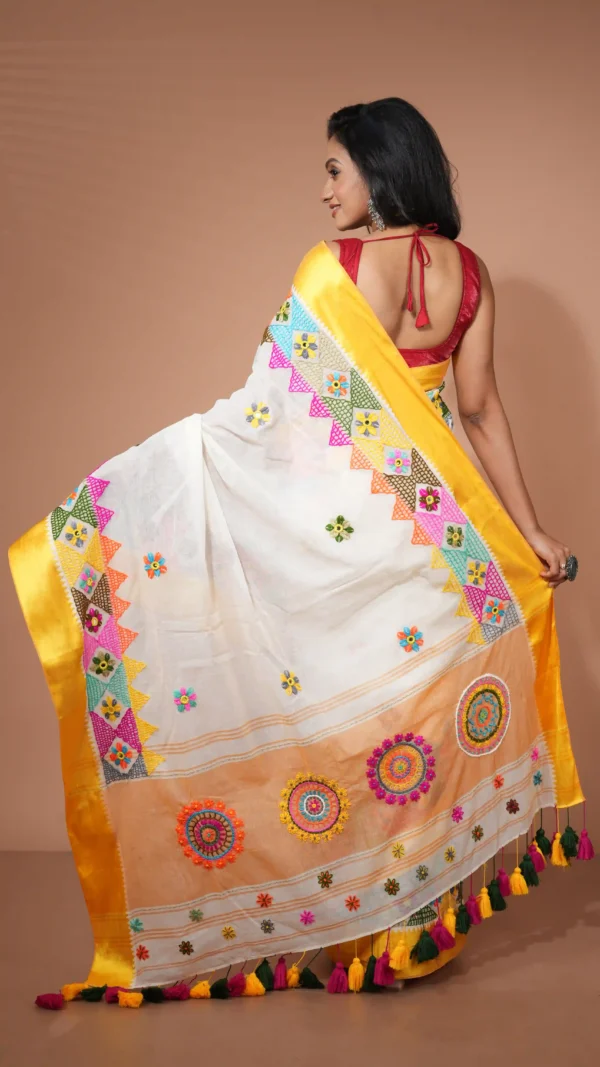 Elegant White Cotton Silk Saree with Vibrant Multicolor Lambani Embroidery | 2025