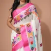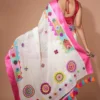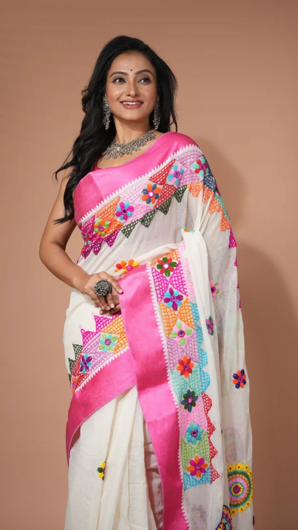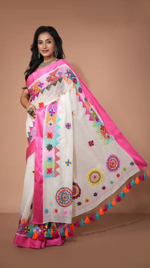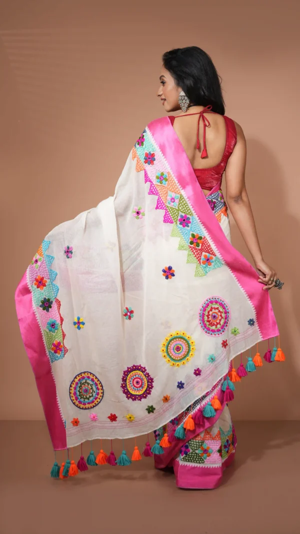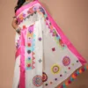 White Cotton Silk Saree with Vibrant Multicolor Lambani Embroidery | 2025