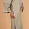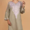 The highlight of this Beautiful Grey Kashmiri Phiran with Aari Embroidery is the artisanal craftsmanship. The floral Aari motifs are stitched in contrasting vibrant threads, creating a beautiful tactile experience.