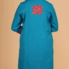 The Sky Blue Pure Woolen Long Jacket with Kashmiri Aari Embroidery celebrates the centuries-old “Aari” craft, a heritage skill passed down through generations in Northern India.