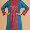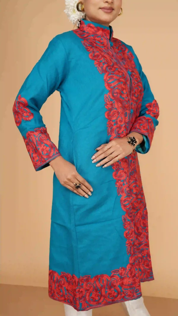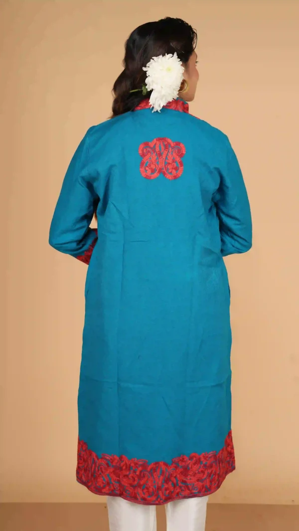 The Sky Blue Pure Woolen Long Jacket with Kashmiri Aari Embroidery is designed for the woman who demands both comfort and high-fashion impact. Its long-line silhouette provides a flattering, elongated look while offering superior insulation against the winter chill.