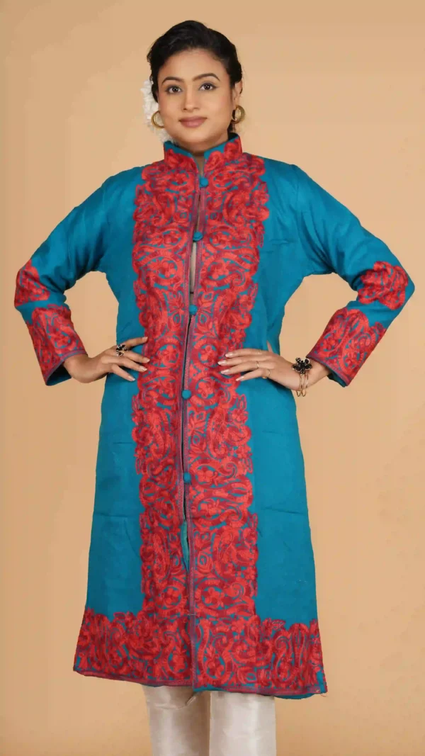 Sky Blue Woolen Long Jacket with Kashmiri Aari Embroidery | Ethnic Essentials 2026