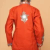 The Rustic Orange Kashmiri Aari Embroidered Pure Woolen Short Jacket is a tribute to the “Aari” craft that flourished under the patronage of the Mughal emperors. Each stitch is a testament to the patience of the craftsmen who spend hours creating these detailed floral patterns.