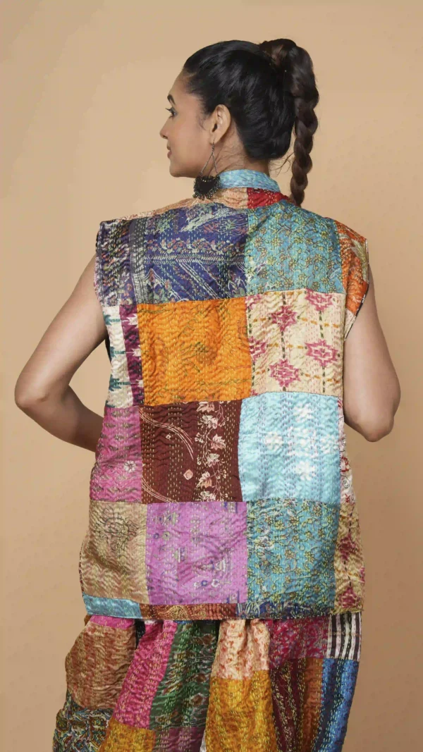 The Handmade Patchwork Kantha Embroidery Cotton Jacket celebrates the centuries-old tradition of Kantha, a craft originating from West Bengal.
