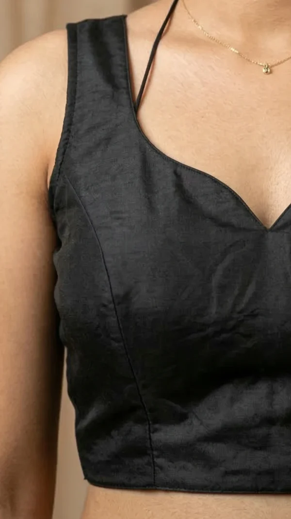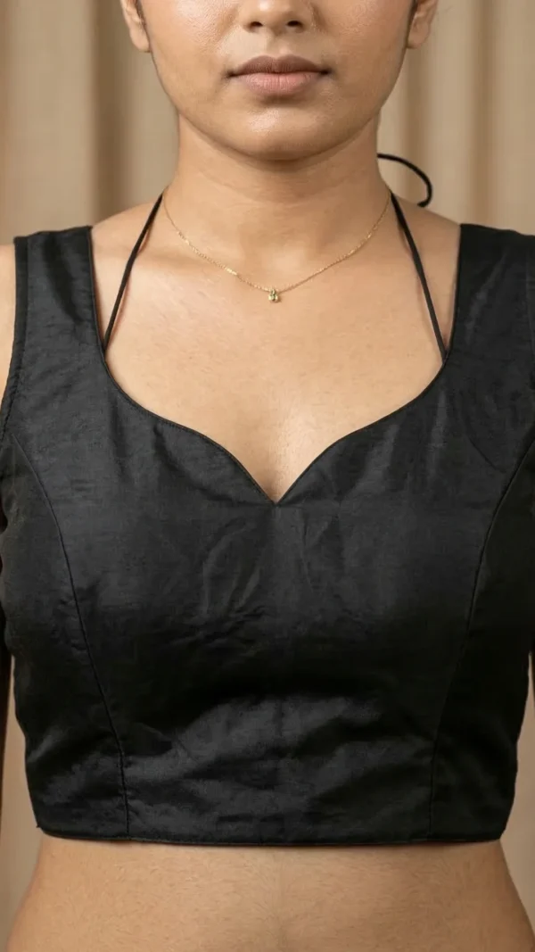 When it comes to versatility, the Classic Black Sleeveless Silk Blouse stands unmatched. The fabric feels like a second skin, offering breathable comfort without compromising on the structured fit required for a refined look. Whether you are pairing it with a heavy Banarasi saree or a lightweight chiffon drape, this blouse acts as the perfect anchor for your ensemble.