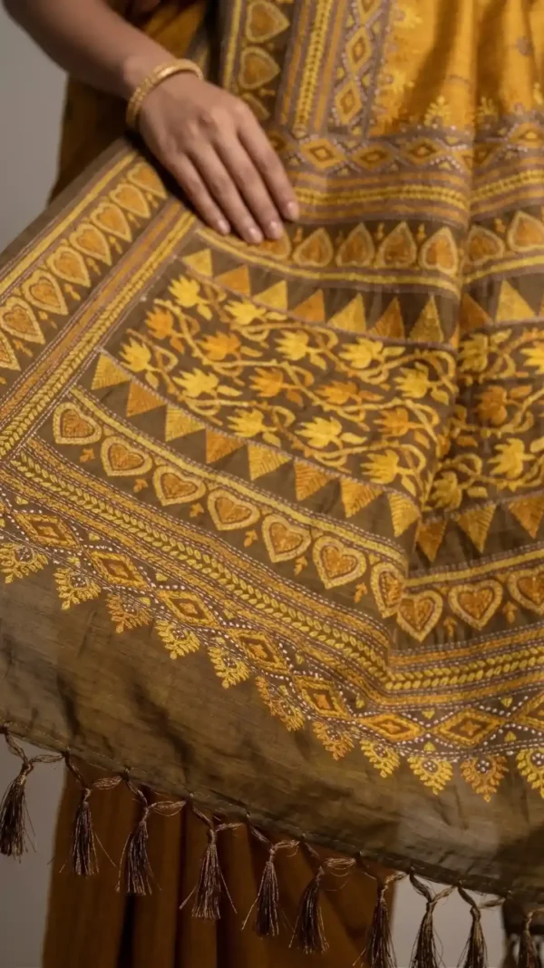 Golden Hour Kantha Embroidery Pure Tussar Silk Saree | Nams Design Exclusive 2026