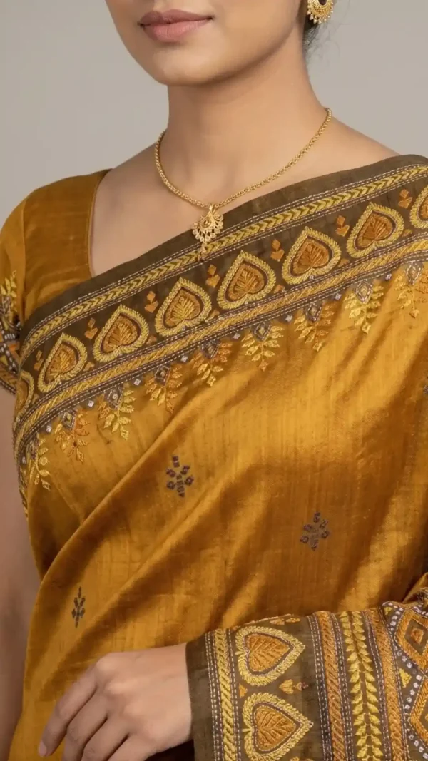 The Golden Hour Kantha Embroidery Pure Tussar Silk Saree is designed for the woman who loves to wear her personality. The result is a saree that feels lightweight and breathable while maintaining the heavy, regal drape of pure silk.