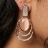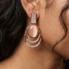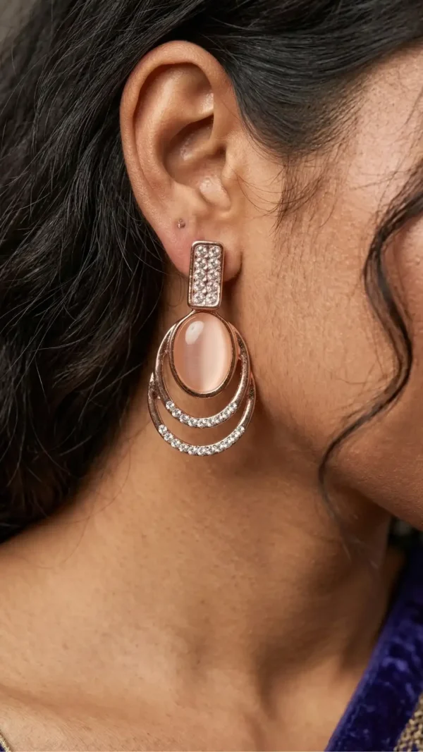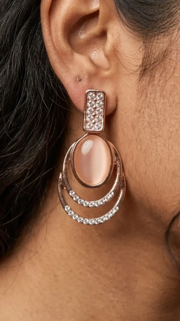The Tiered Rose Gold Crystal Earrings are a breathtaking blend of architectural design and soft, feminine radiance. Each earring features a crystal-encrusted rectangular stud that flows into a triple-tiered drop. The center boasts a luminous peach-toned oval inlay, cradled by two shimmering crystal-paved crescents.