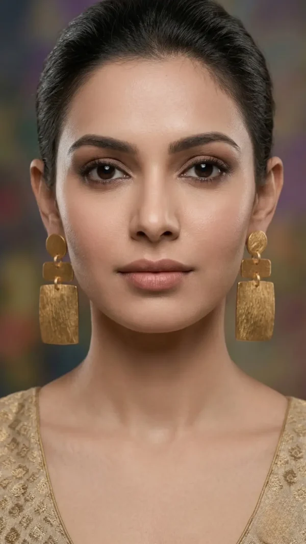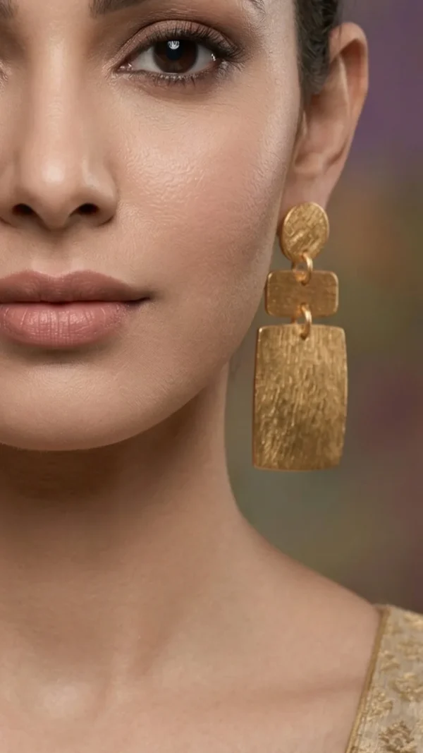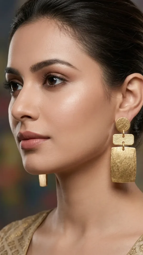 The Gold Geometric Tiered Drop Earrings are a stunning testament to minimalist luxury and architectural design. Featuring three distinct tiers—a circular stud, a horizontal rectangle, and a bold vertical base—these earrings create a sophisticated linear flow that elongates the neck. Crafted with a premium “brushed” satin finish, this Gold Geometric Tiered Drop Earrings set offers a subtle shimmer rather than a harsh glare, making them the perfect “regal” accessory for both professional settings and high-fashion evening events.
