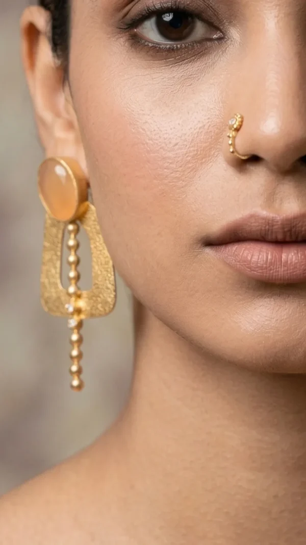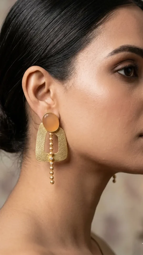 The Geometric Amber Bead Drop Earrings are a stunning fusion of contemporary silhouettes and earthy elegance. Featuring a soft, honey-toned oval cabochon at the stud, these earrings cascade into a hammered gold-tone geometric frame. This set is designed to turn heads, offering a bold, intellectual vibe that elevates any outfit from ordinary to extraordinary.