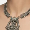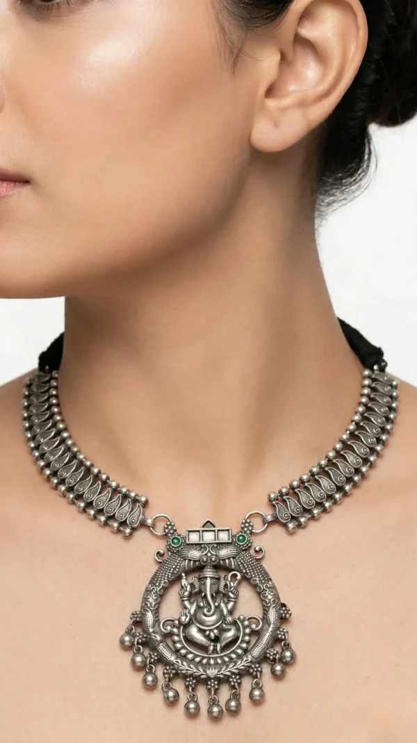nvoke a sense of divine grace with our Divine Aura Oxidised Temple Necklace. This statement piece features a centerpiece circular medallion portraying Lord Ganesha, intricately framed by floral filigree and delicate silver droplets.