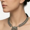 Attached to a traditional black braided thread dori, the choker is fully adjustable to ensure a comfortable and secure fit. Whether you’re dressing for a festive puja, a wedding, or looking to add a spiritual touch to a modern fusion ensemble, this handcrafted set offers a bold yet timeless appeal. Discover more about authentic Indian crafts at the Ministry of Textiles, India.