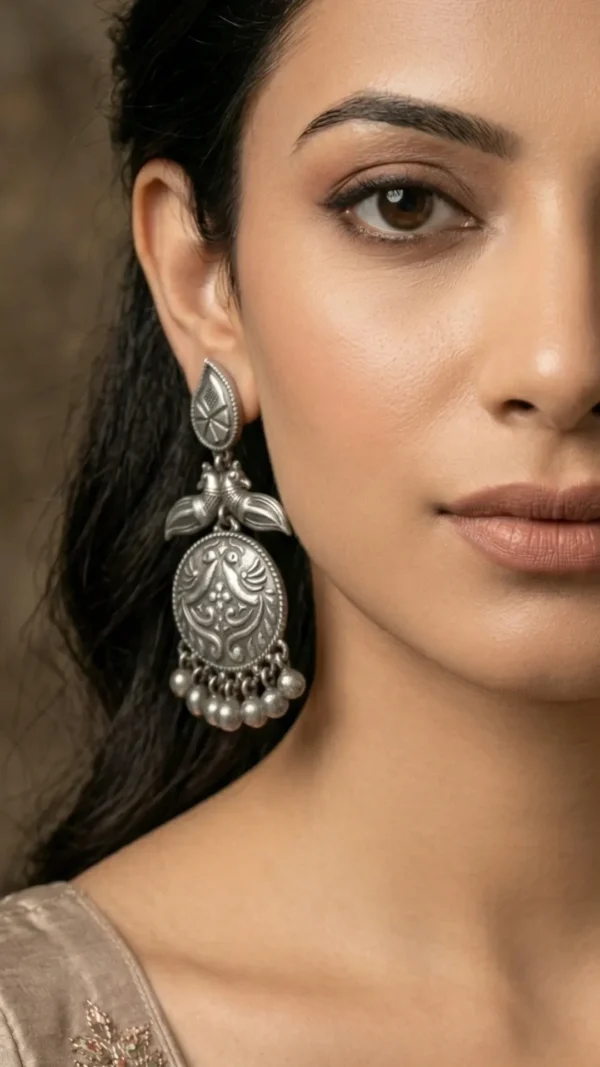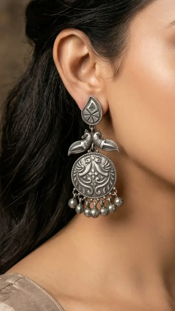 Add a touch of flair and opulence with our unique Twinning Flight Oxidised Drop Earring. This exquisite design is a must-have for the festive season. 100% authentic Indian craftsmanship.