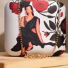 Discover the perfect blend of modern grace and floral elegance with our handcrafted statement fashion clutch. Featuring a minimalist portrait of a woman in a deep emerald saree, this piece is designed to command attention. The artwork is beautifully framed by oversized, vibrant red roses and dark botanical leaves, creating a high-contrast look against the crisp white background.